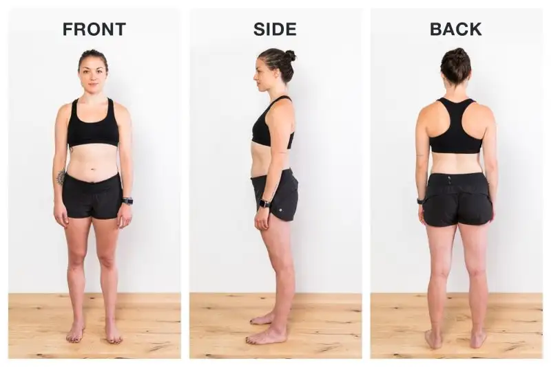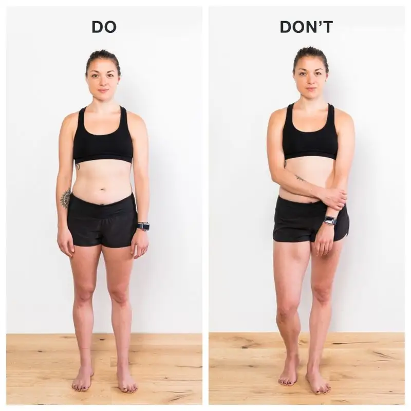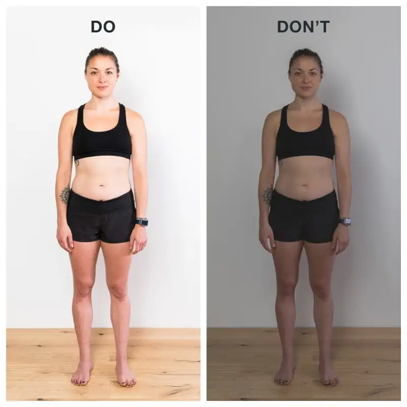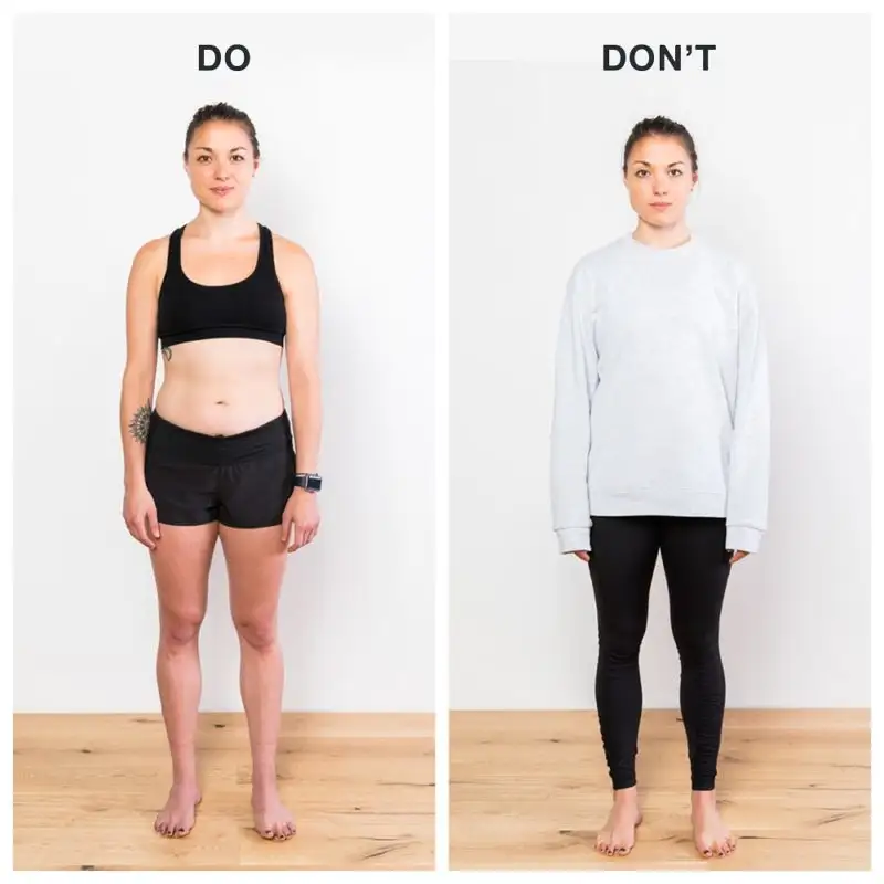 To compare the changes, you’ll need to see the changes. It’s impossible to do this if you’re wearing a baggy t-shirt or shorts. Form-fitting activewear/swimwear is best. Your stomach area should be visible, as this is a great indicator of weight loss and/or muscle gain.